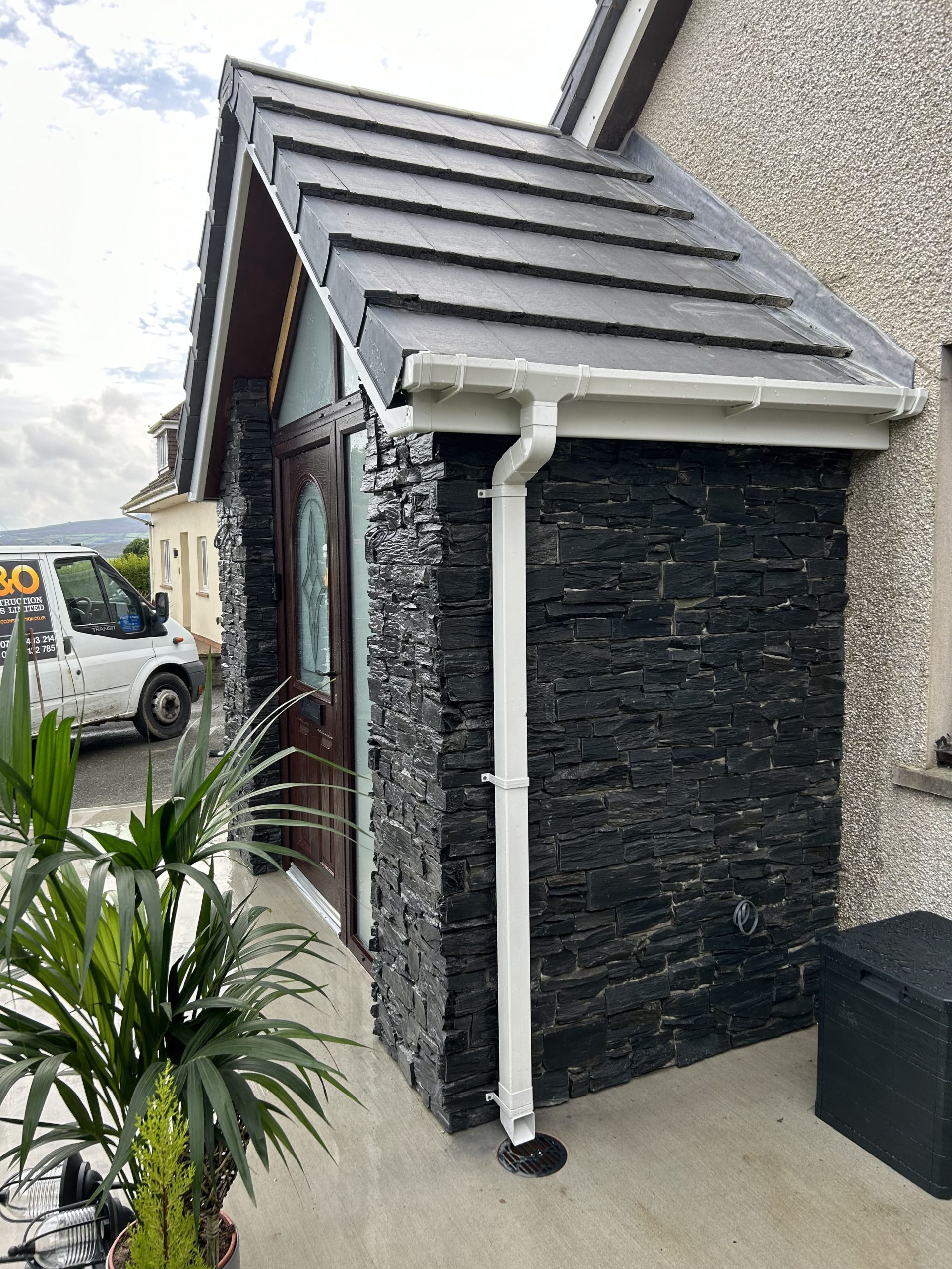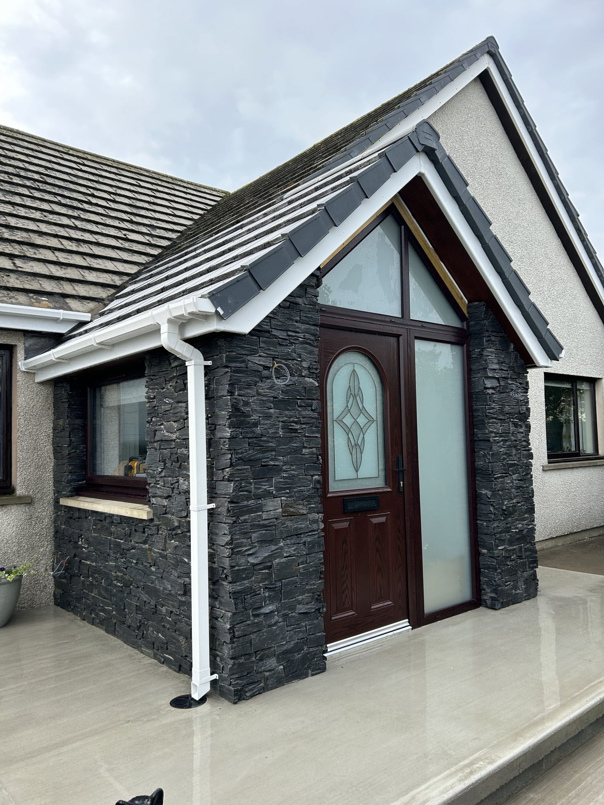A bespoke porch extension to an existing bungalow, featuring natural stone cladding and a vaulted ceiling to create a striking and characterful entrance.